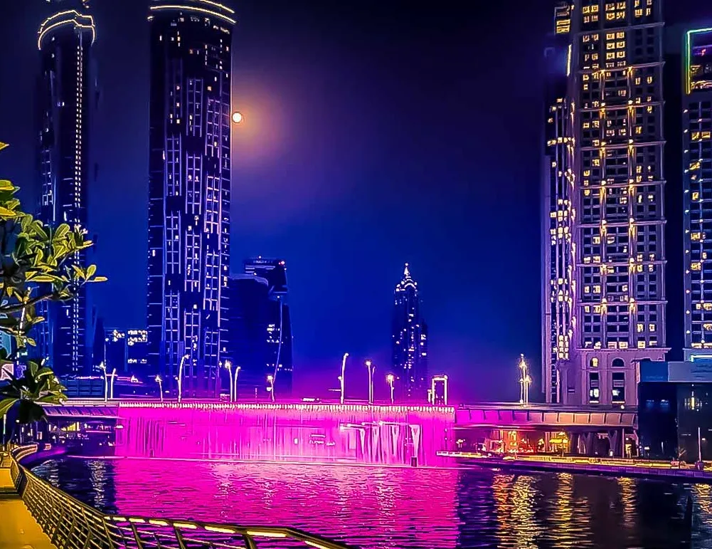 - Scenic views of Burj Khalifa, Business Bay Bridge & Dubai Waterfall