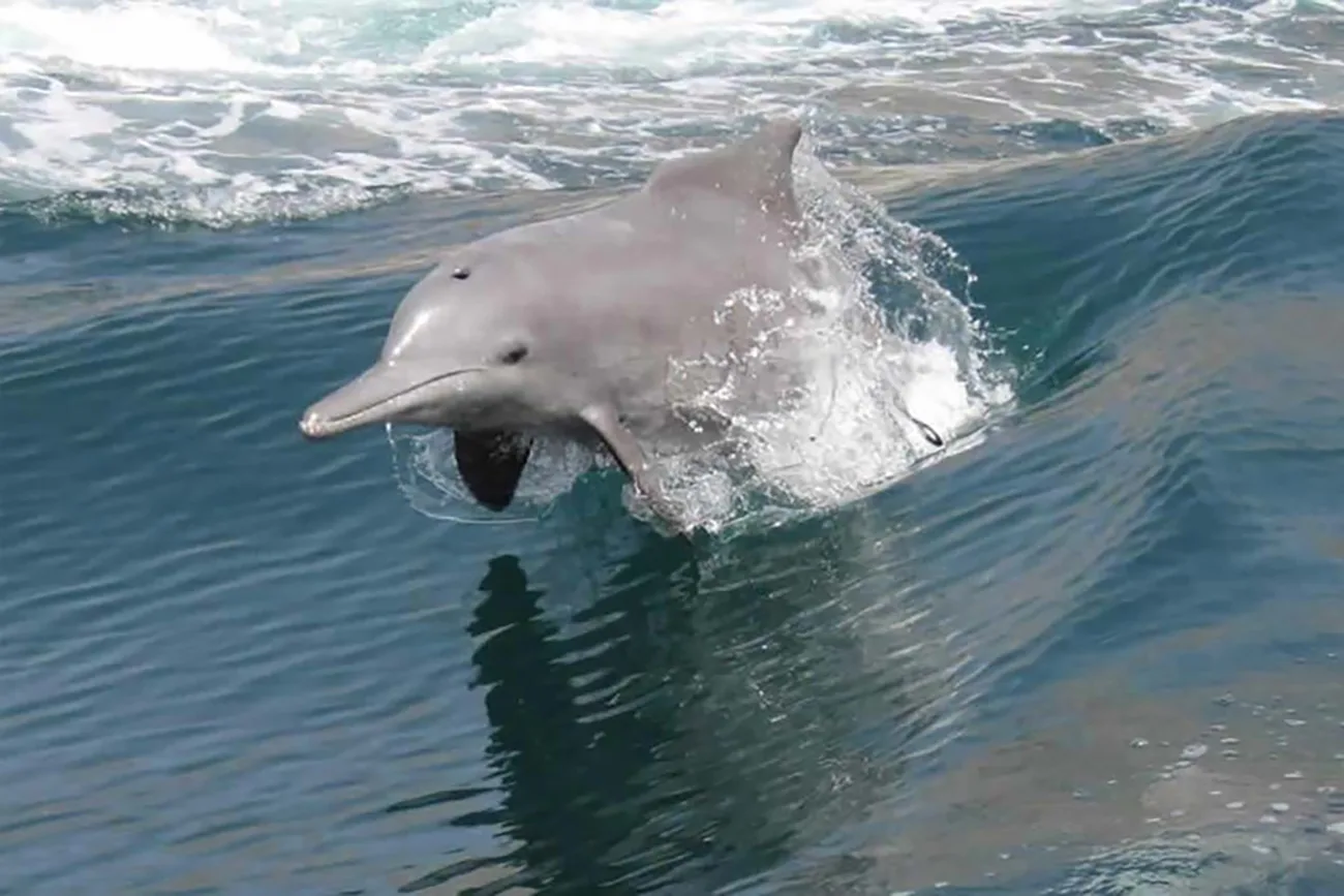 Spot playful dolphins swimming alongside the boat in their natural habitat.